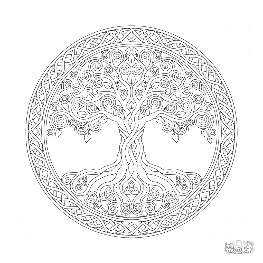 Detaillierte Baum-des-Lebens-Mandala im keltischen Knotenstil zum Ausmalen für 10-12 Jährige. Ineinandergreifende Äste, Spiralen, Dreieinigkeits-Symbole, perfekte Symmetrie.