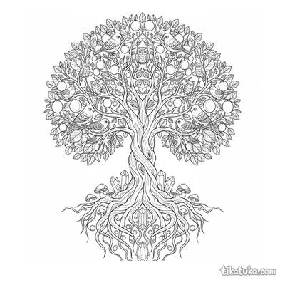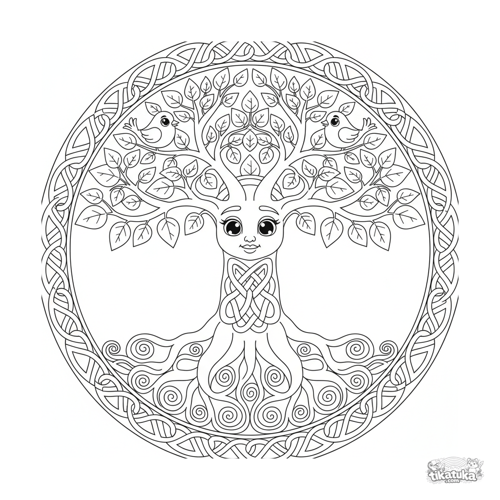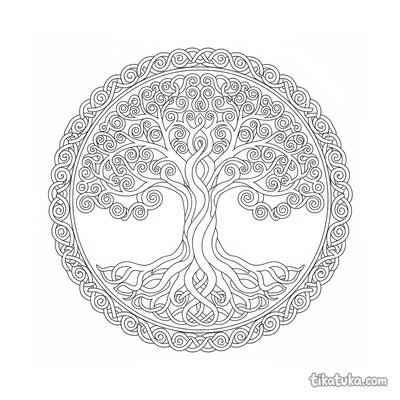 Komplexes keltisches Baum-des-Lebens-Mandala-Ausmalbild für 10-12 Jahre. Stamm und Äste aus geflochtenen Knoten, Wurzeln, Blätter und Vögel. Symmetrisches Knotenmuster.