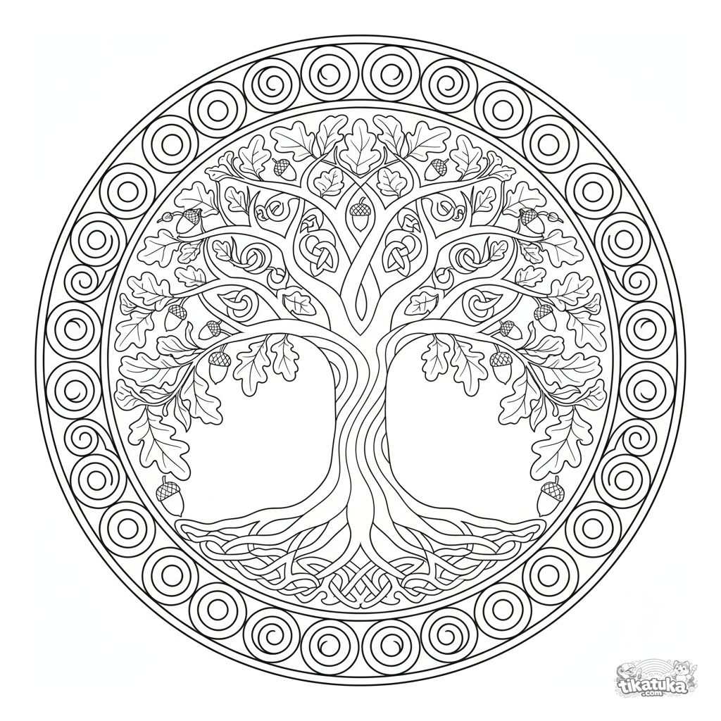 Detaillierte Baum-des-Lebens-Mandala im keltischen Knotenstil für 10-12 Jahre. Verwobene Äste, Knotenmuster, Eicheln, symmetrische Komposition.