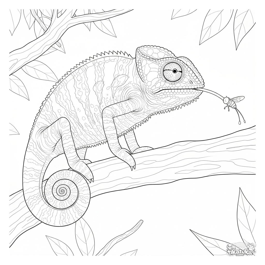 Detailliertes Ausmalbild eines Chamäleons für Kinder von 8-12 Jahren. Tarnt sich auf einem Dschungelast, Augen bewegen sich unabhängig, Zunge ausgestreckt.
