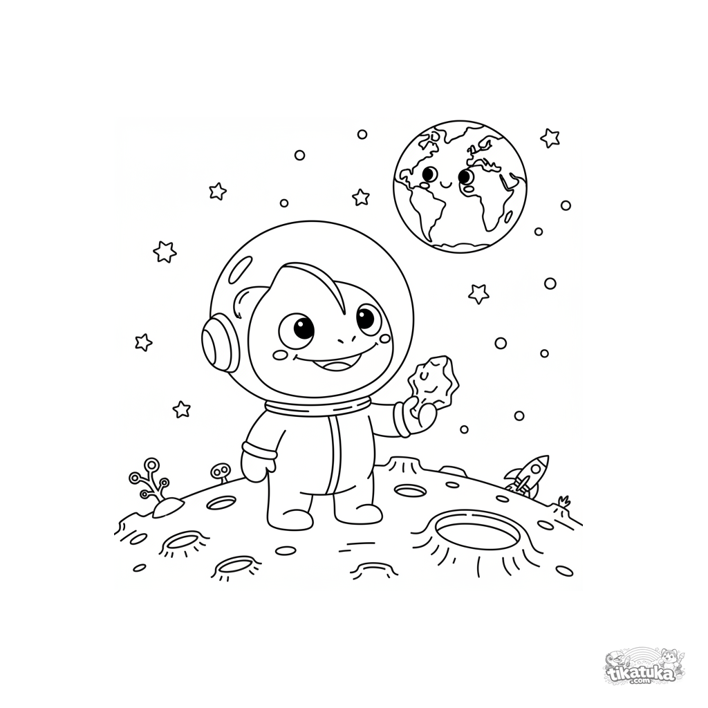 Weltraum-Ausmalbild für Kinder 4-6: Plüschchamäleon Radik im Raumanzug erforscht die Mondoberfläche. Skandinavischer Maskottchen-Stil.