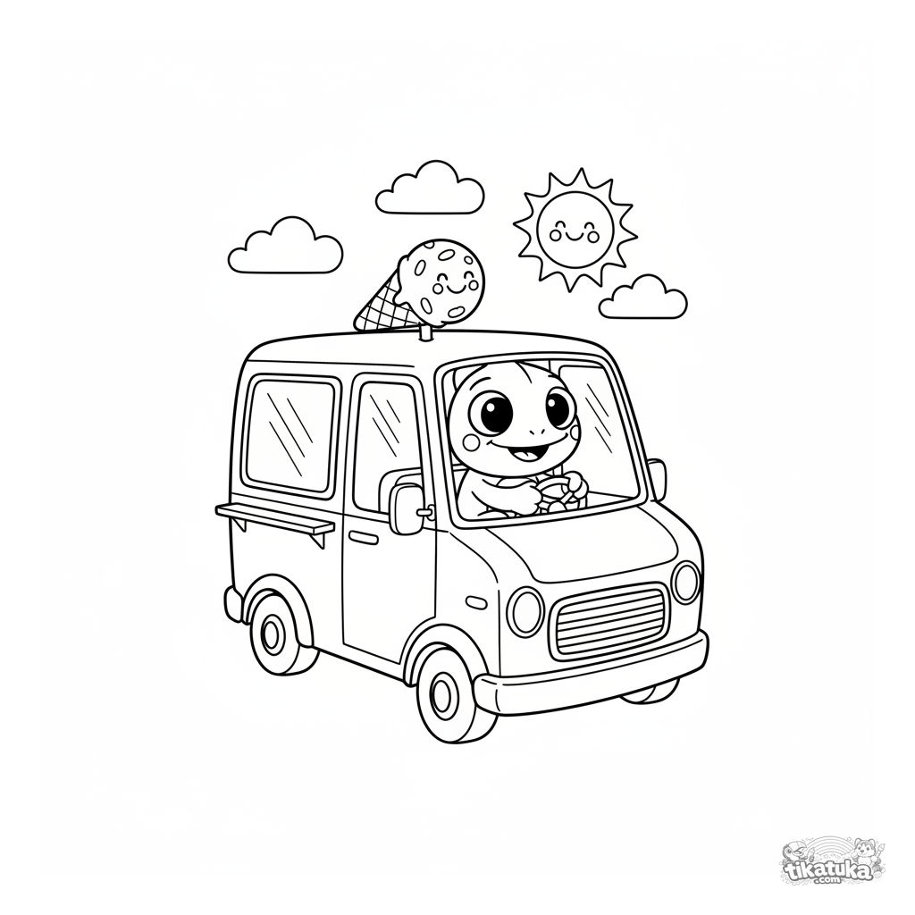 Ausmalbild für Jungen von 4-6 Jahren. Chamäleon Radik fährt einen fröhlichen Retro-Eiswagen. Plüschmaskottchen-Stil, erkennbare Fahrzeugformen, breite Ränder zum Ausmalen.