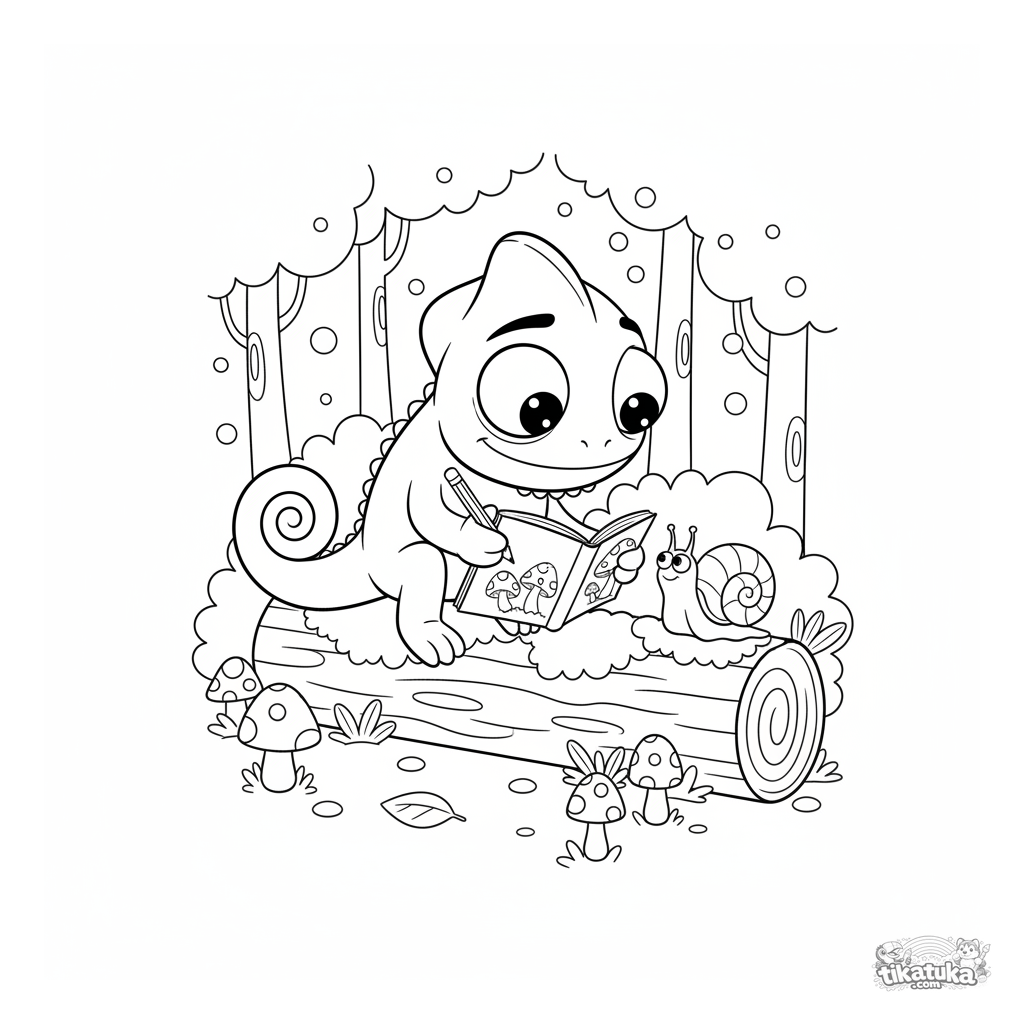 Ausmalbild für Kinder von 4-6 Jahren. Niedliches Chamäleon Radik zeichnet Pilze im Wald. Skandinavischer Plüschstil, klare Linien, breite Ränder zum Ausmalen.