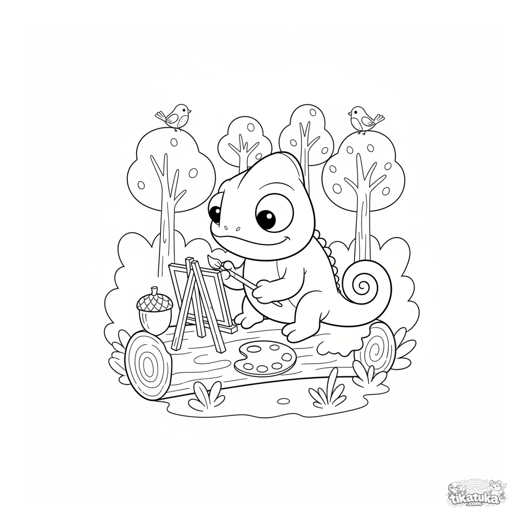 Ausmalbild für Kinder 4-6: süßes Chamäleon Radik malt im Wald auf einer kleinen Staffelei. Skandinavischer Plüschstil, einfache Linien, breite Ränder.