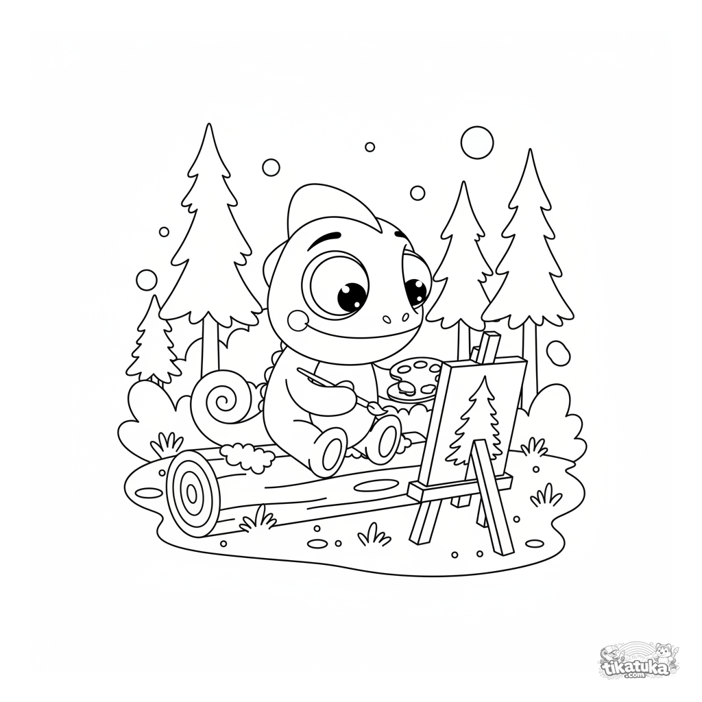 Ausmalbild für Kinder 4-6: Plüschchamäleon Radik malt ein Bild auf einer Waldlichtung. Niedliche Szene im skandinavischen Spielzeugstil.