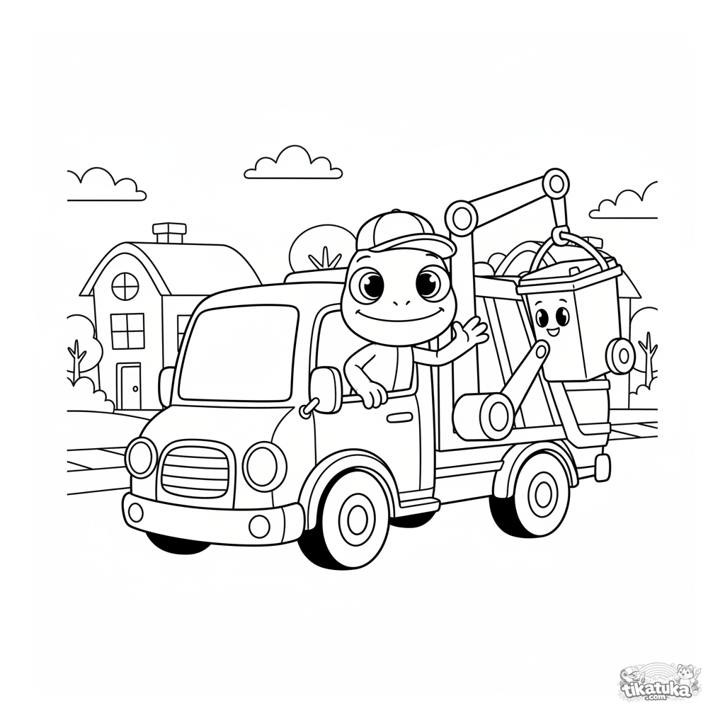 Fahrzeug-Ausmalbild für Jungen 4-6: Chamäleon Radik fährt einen freundlichen Müllwagen auf einer ruhigen Straße. Soft-Puppen-Stil.