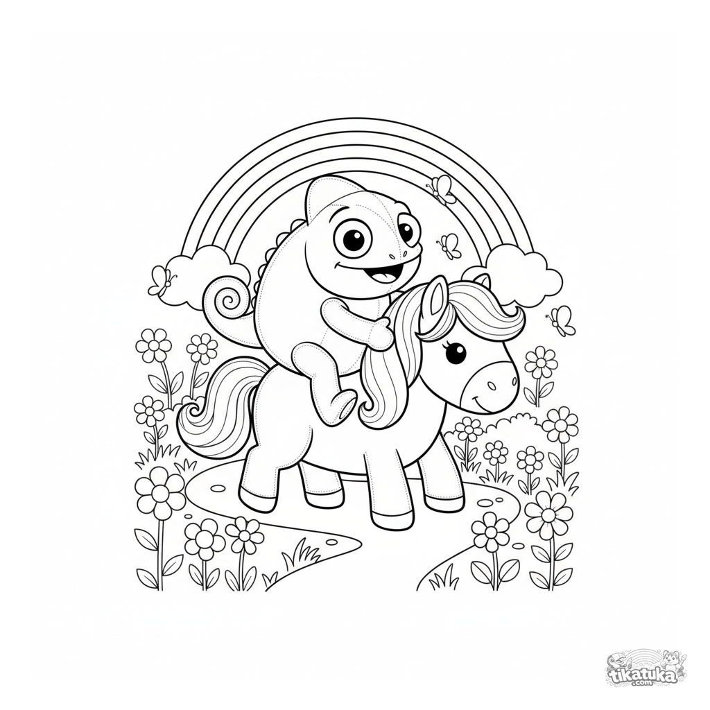 Ausmalbild für Mädchen 4-6: Chamäleon Radik reitet auf einem magischen Pony unter einem Regenbogen auf einer blühenden Wiese. Soft-Puppen-Stil.