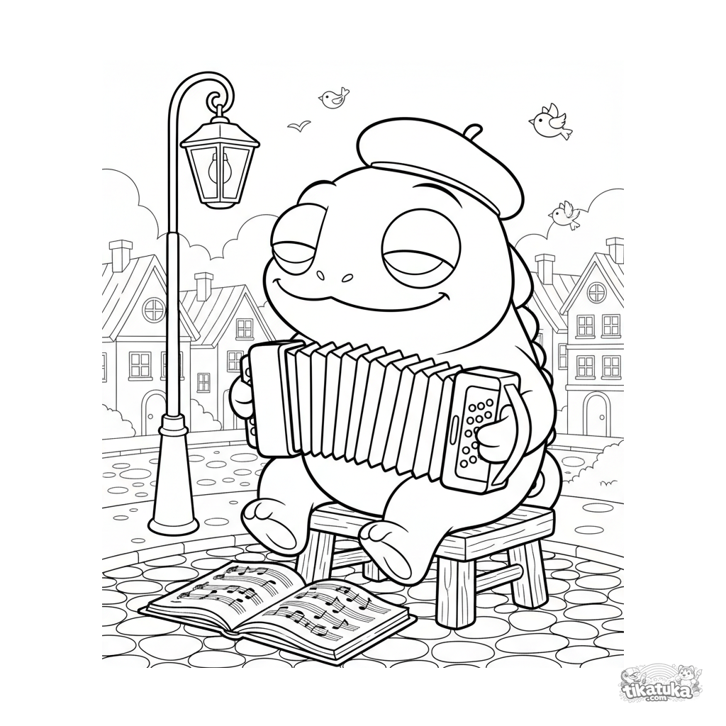 Ausmalbild für Kinder: Chamäleon Radik mit Baskenmütze spielt Akkordeon auf einem gemütlichen Dorfplatz. Süßes Charakterdesign, einfacher Hintergrund, für 5-9 Jahre.