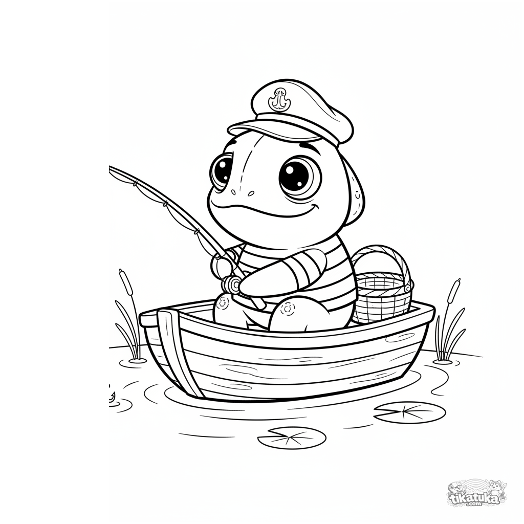 Kinder-Ausmalbild: Chamäleon Radik angelt von einem Ruderboot auf einem ruhigen Teich. Friedliche, niedliche Szene über Wasser.