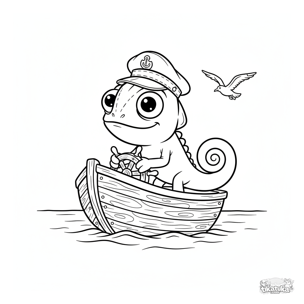 Ausmalbild für Kinder 4-6: Chamäleon Radik in einer Matrosenmütze steuert selbstbewusst ein kleines Holzsegelschiff auf einem ruhigen See.