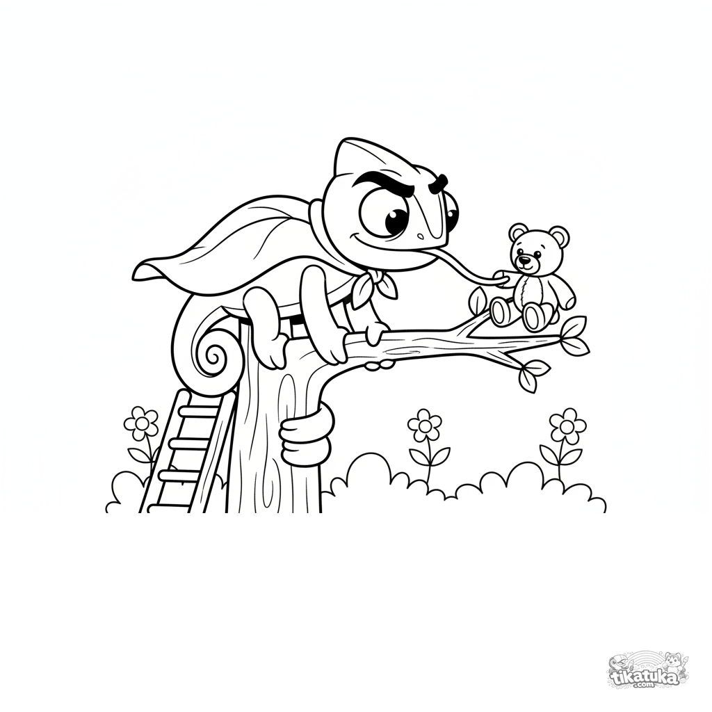 Ausmalbild für Kinder 4-6: Chamäleon Radik als Superheld, der einen Plüschteddy von einem Baum rettet. Geometrischer Holzspielzeugstil, dynamische Pose, einfache Formen.