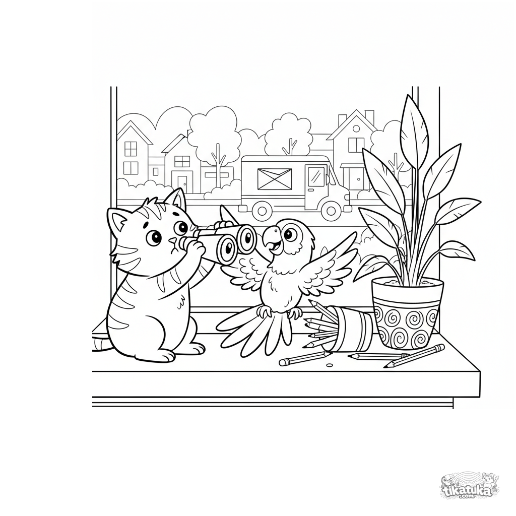 Ausmalbild für Kinder 10-12: eine chaotische Katze und ein Papagei auf einer Fensterbank, die versuchen, sich ein Fernglas zu teilen und dabei Dinge umwerfen. Dynamische Comic-Abenteuer-Szene.