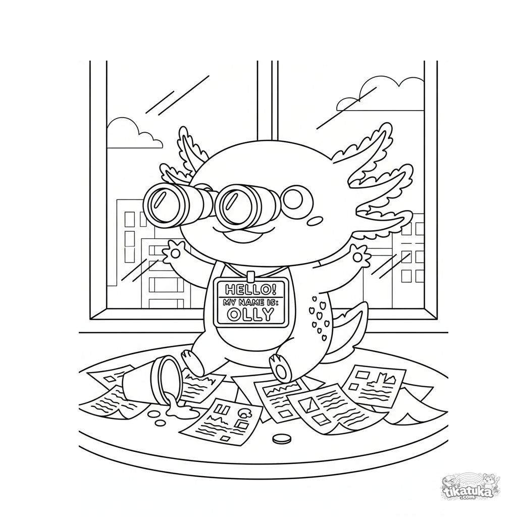 Ausmalbild für Kinder 10-12: ein chaotischer Axolotl im Büro drückt sich gegen das Fenster und sucht mit einem Fernglas nach dem Gehalt. Detailliertes lustiges Meme.
