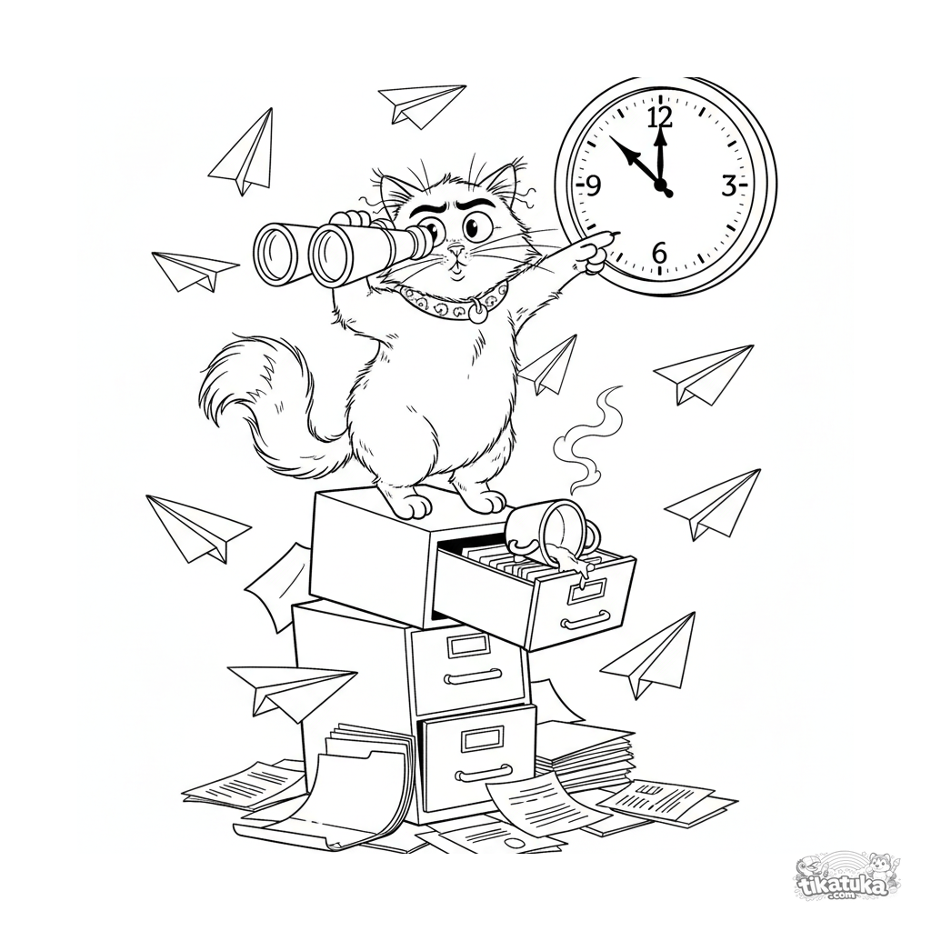 Ausmalbild für Kinder 10-12: Eine chaotische Bürokatze balanciert auf Aktenschränken, schaut panisch mit einem Fernglas auf die Uhr. Detailliertes lustiges Meme.
