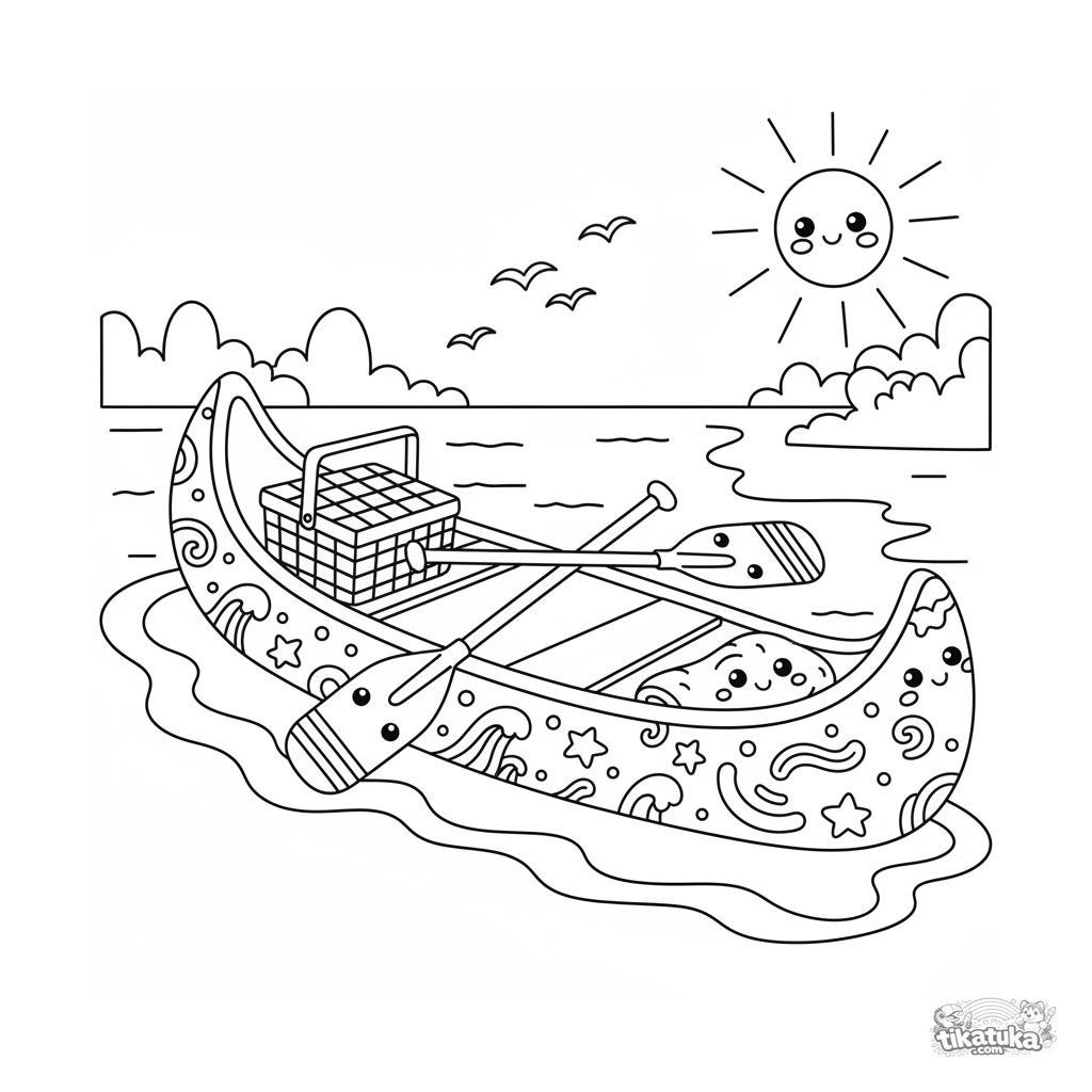 Ausmalbild für Kinder 4-6: Ein fröhliches Kanu mit Picknick am Seeufer. Helle Details und klare Formen für die Motorik.