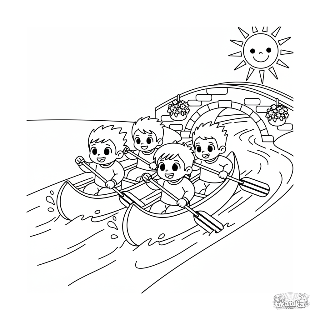 Ausmalbild für Kinder 4-6: Fröhliche Kanus rennen einen sonnigen Kanal unter einer Steinbrücke entlang. Dynamische Szene mit klaren Formen.