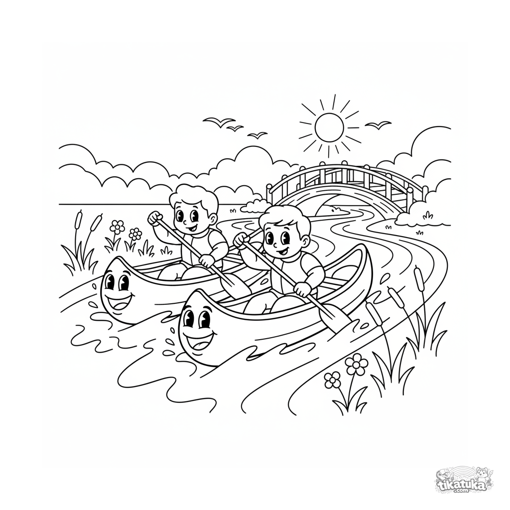 Ausmalbild für Kinder von 4-6: fröhliche Zeichentrick-Kanus, die einen sonnigen Fluss hinunterfahren. Eine helle, dynamische Szene.