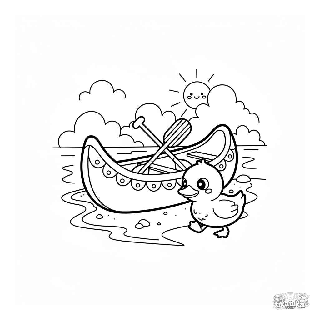 Ausmalbild für Kinder 4-6: Ein fröhliches, gestreiftes Kanu ruht am sandigen Seeufer mit Paddeln darin und einem neugierigen Entenküken in der Nähe.