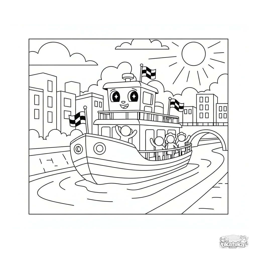 Ausmalbild für Kinder 4-6: Eine fröhliche Fähre mit karierten Flaggen überquert einen sonnigen Stadtkanal. Helle, freundliche Szene.