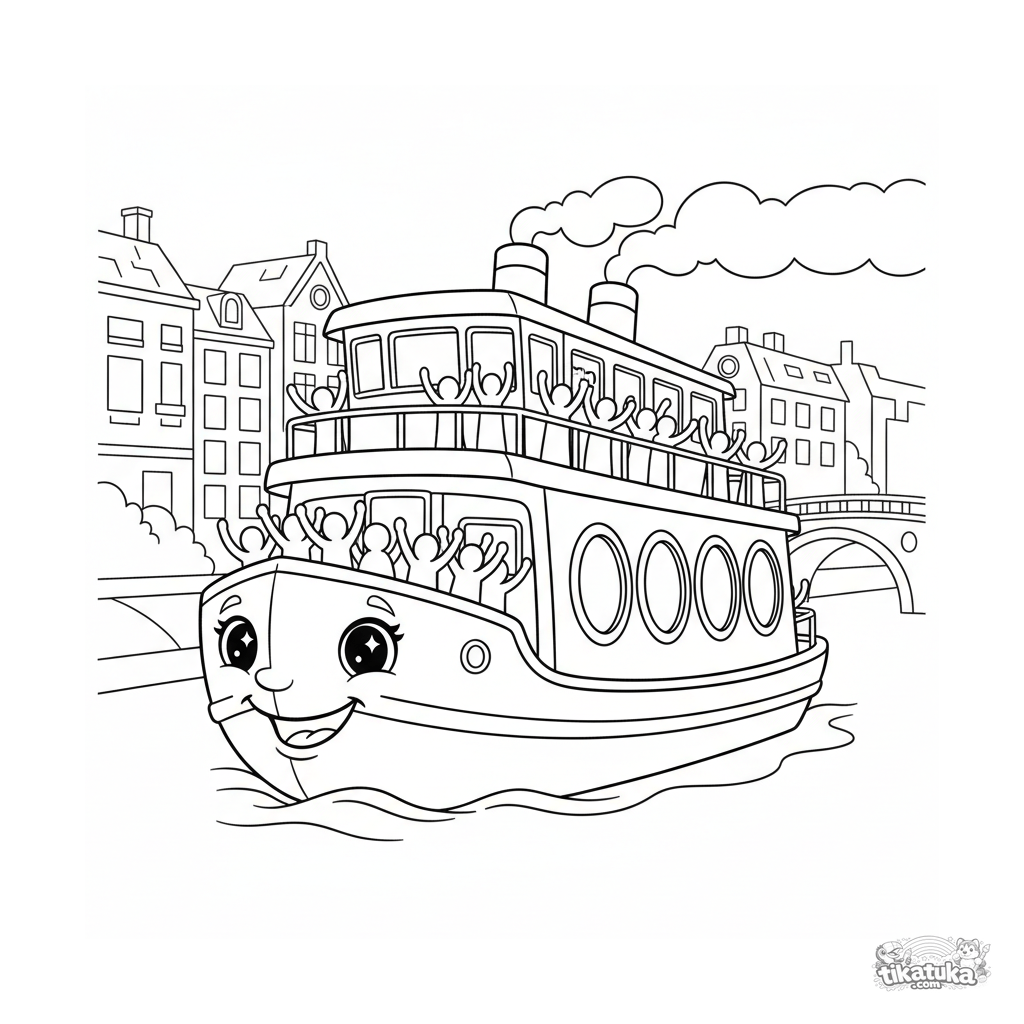 Ausmalbild für Kinder 4-6: eine fröhliche Flussfähre fährt einen Stadtkanal entlang. Viele Fenster und Passagiere zum Ausmalen.