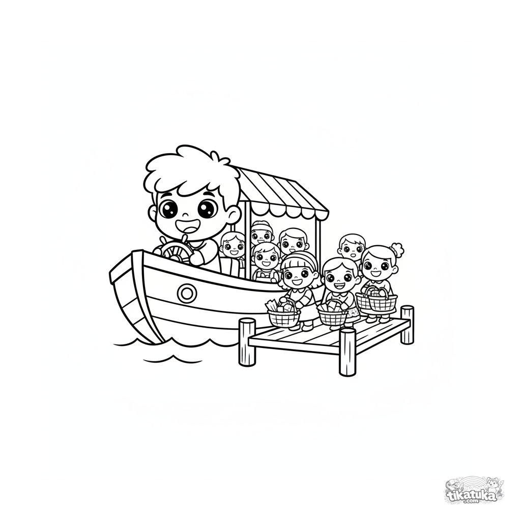 Einfaches Ausmalbild für Kleinkinder 2-3: Eine fröhliche Fähre nähert sich einem Steg. Große einfache Formen, wenige Details, perfekt für erste Buntstifte.