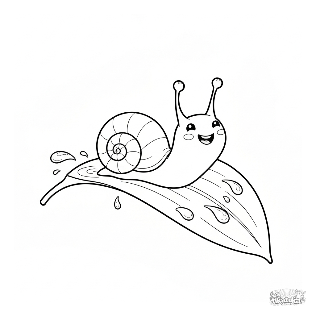 Einfaches Ausmalbild einer fröhlichen Schnecke für Kleinkinder von 2-5 Jahren. Die Schnecke rutscht ein nasses Blatt nach dem Regen hinunter.