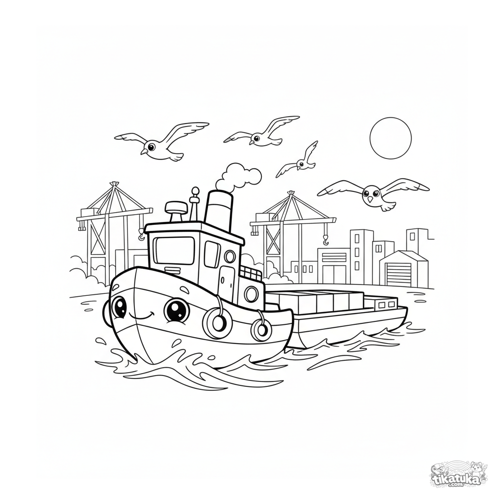 Ausmalbild für Tweens 7-9: Ein fröhlicher Schlepper schiebt einen Lastkahn in einem geschäftigen, sonnigen Hafen. Dynamische Szene mit Möwen und Kränen.
