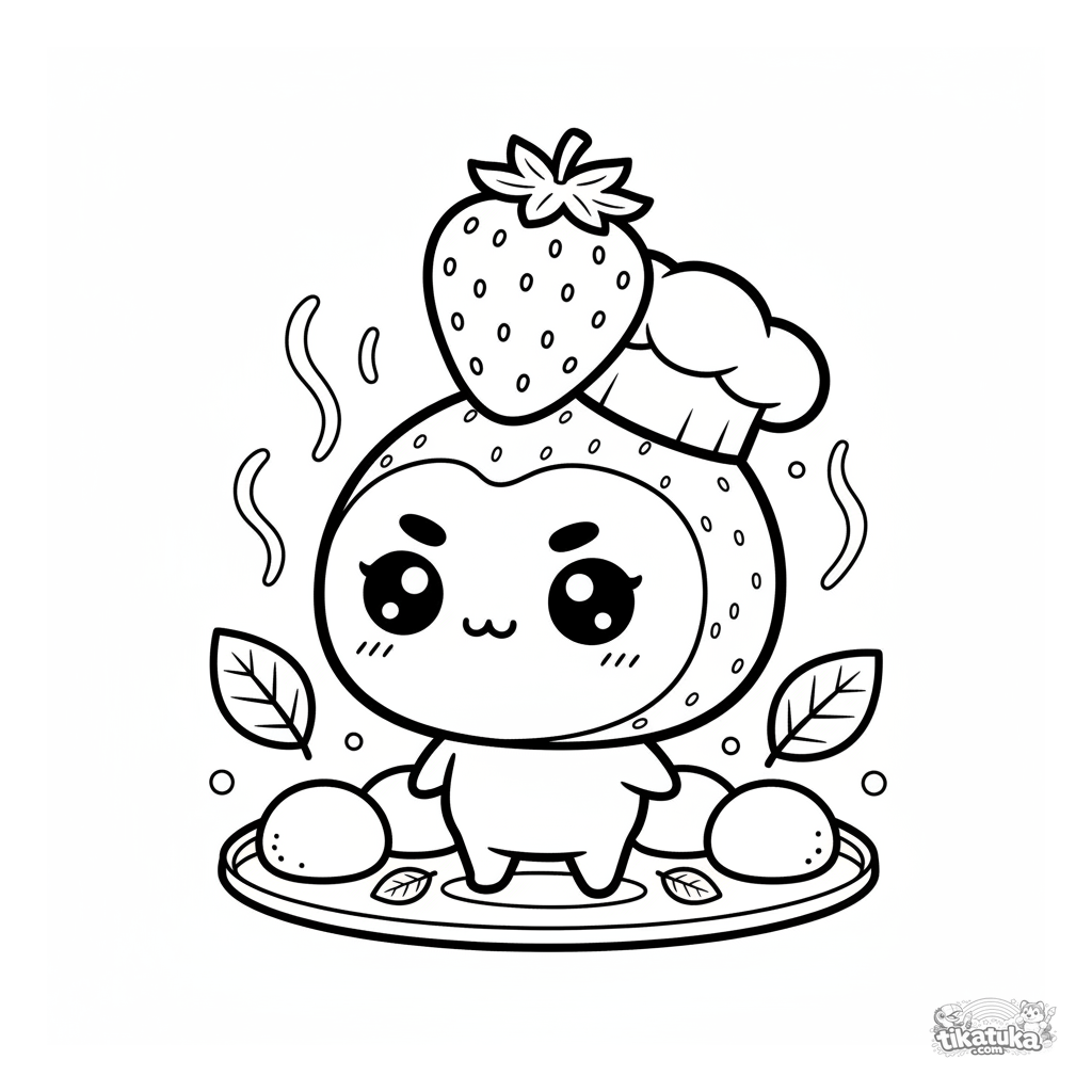 Ausmalbild für Kinder 4-6: Ein süßer Mochi mit Kochmütze balanciert eine Erdbeer auf einem Tablett. Lustige Szene unter anderen Mochi.