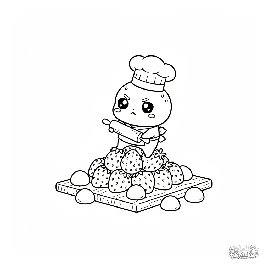 Ausmalbild für Kinder 4-6: Ein süßer Mochi mit Kochmütze balanciert auf einem Erdbeerhaufen mit einem Nudelholz. Szene zwischen anderen Mochi.