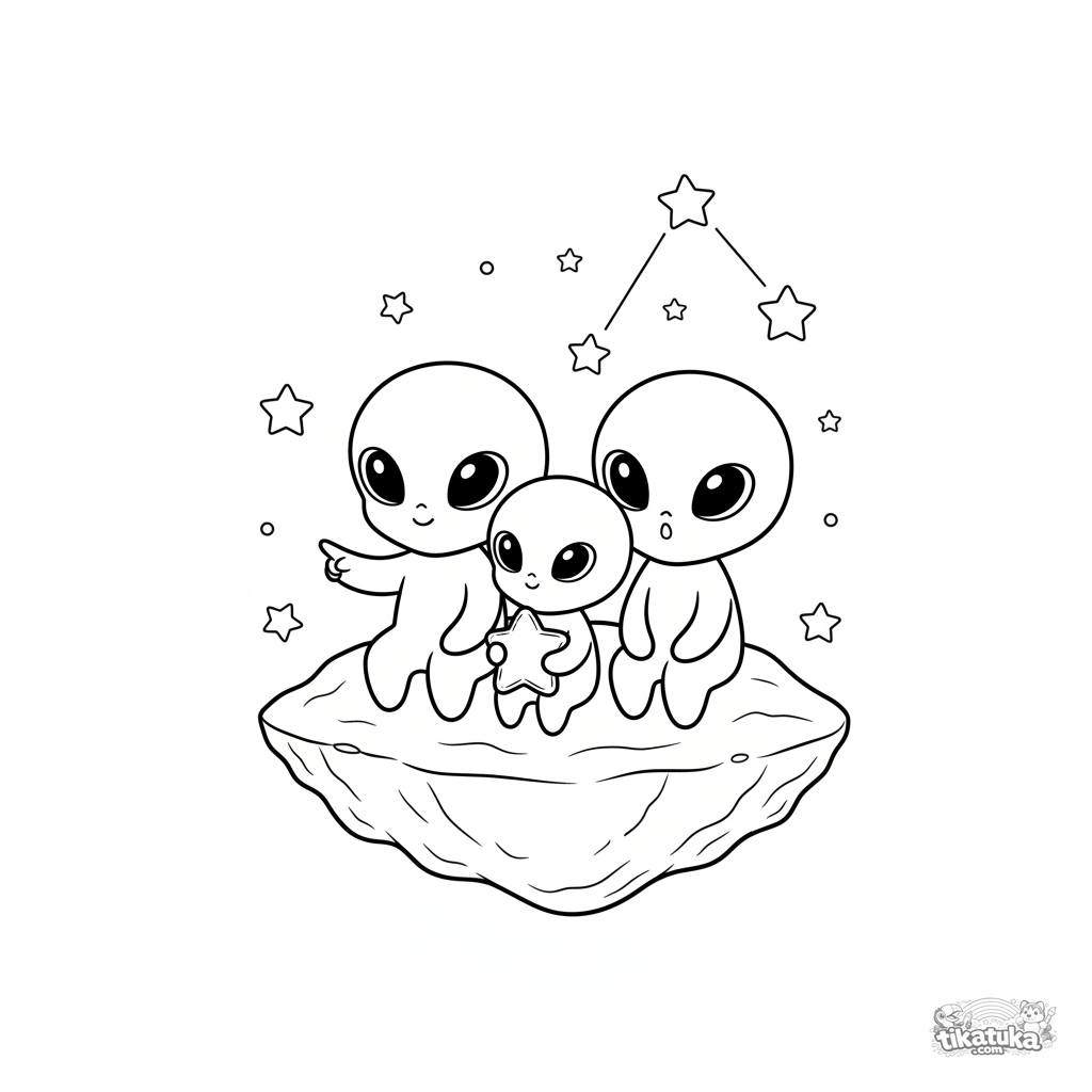 Ausmalbild für 4-6 Jahre: Eine süße Alien-Familie schwebt im Weltall auf einem Felsen und schaut zu den Sternen. Einfache Formen, freundliche Charaktere.
