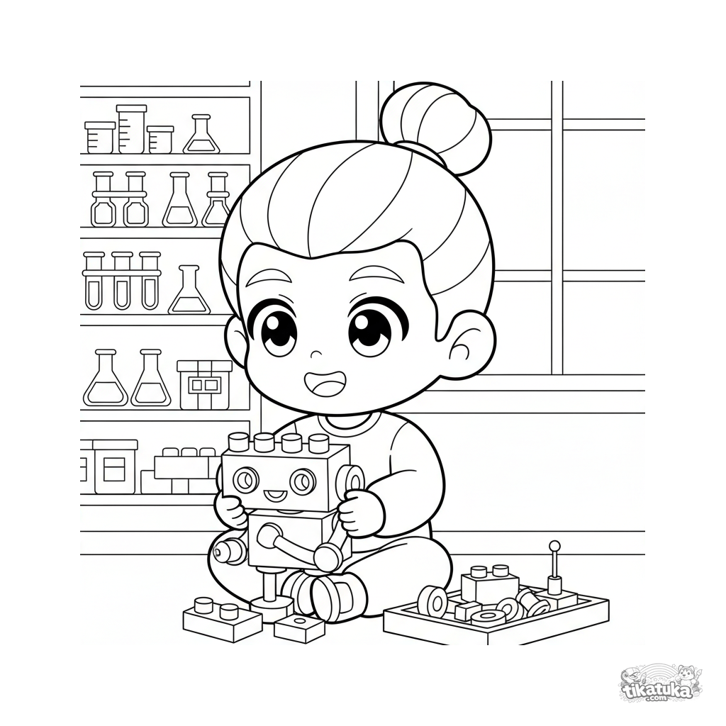 Ausmalbild für Kinder 4-6 im Chibi-Stil: Ein süßer Junge baut in einem geheimen Labor einen winzigen Roboter aus großen Baustein-Teilen zusammen.