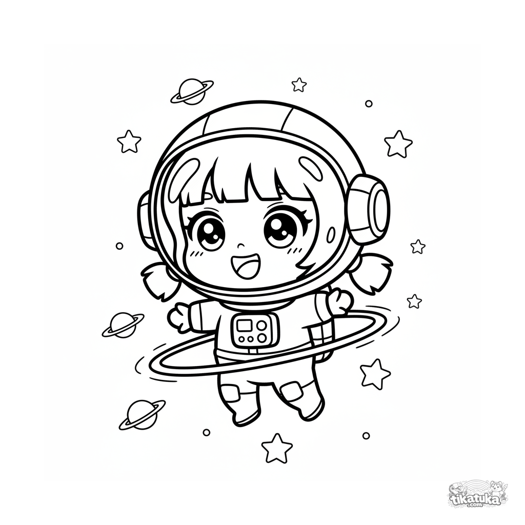 Lustiges Ausmalbild für Kinder 4-6: ein süßer Astronaut im Chibi-Stil dreht einen Reifen in der Schwerelosigkeit. Großer Kopf, einfache Formen.