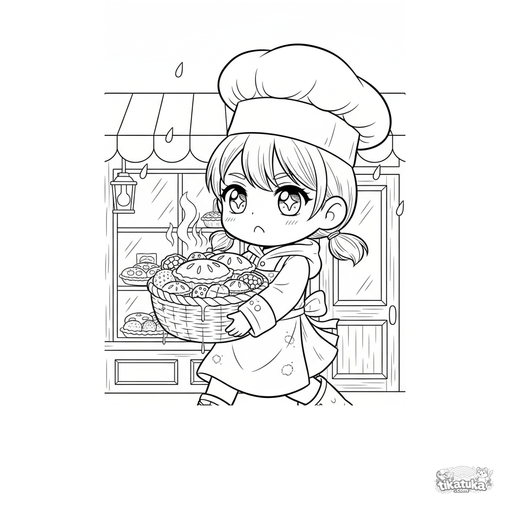 Ausmalbild für Kinder 7-9: Ein Chibi-Bäcker in Gummistiefeln beeilt sich, Kuchen durch ein Herbstdorf im Regen zu liefern.