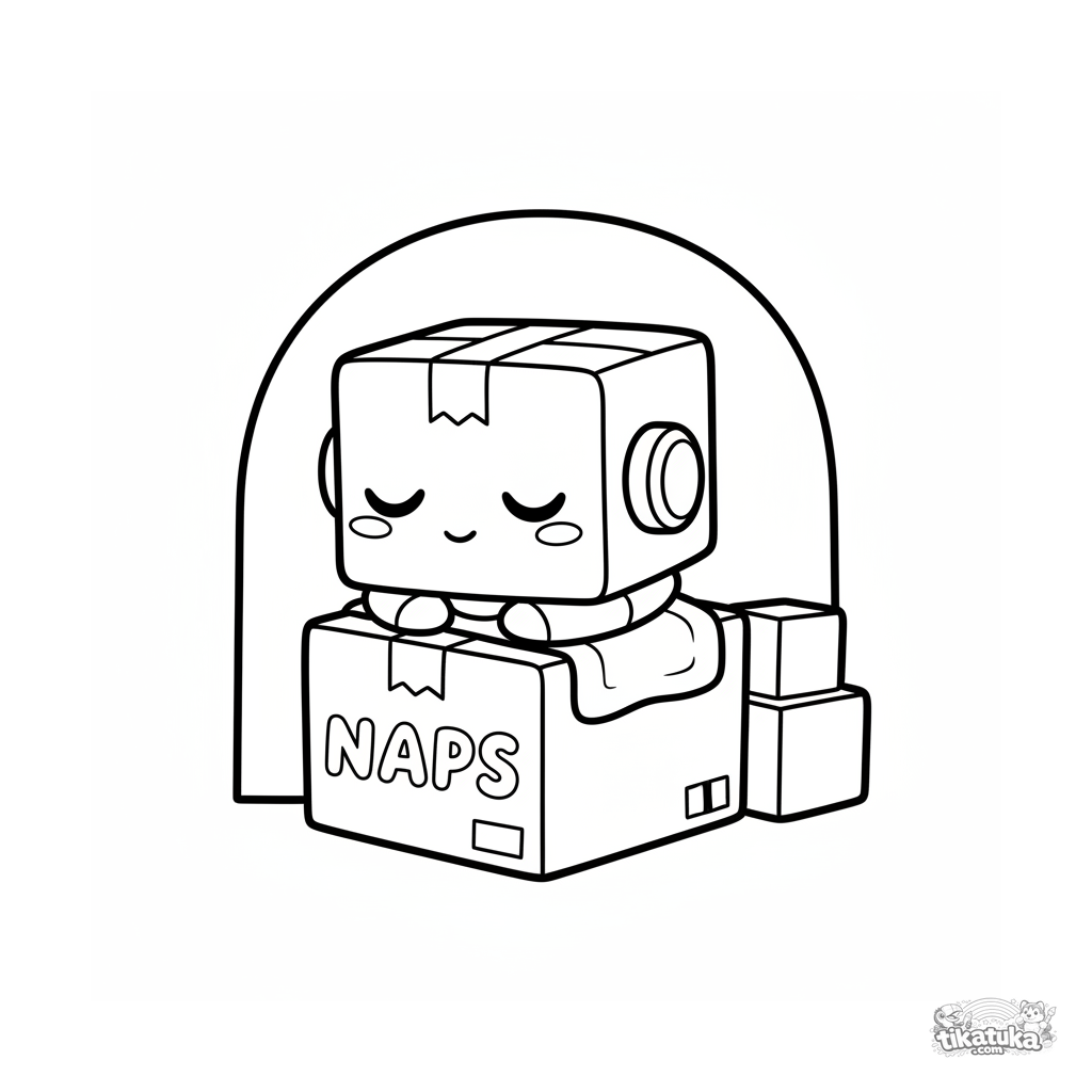 Einfaches Ausmalbild für Kleinkinder 2-3: Ein süßer kistenförmiger Roboter schläft süß auf einem großen Pappkarton in einer ruhigen Lagerecke.