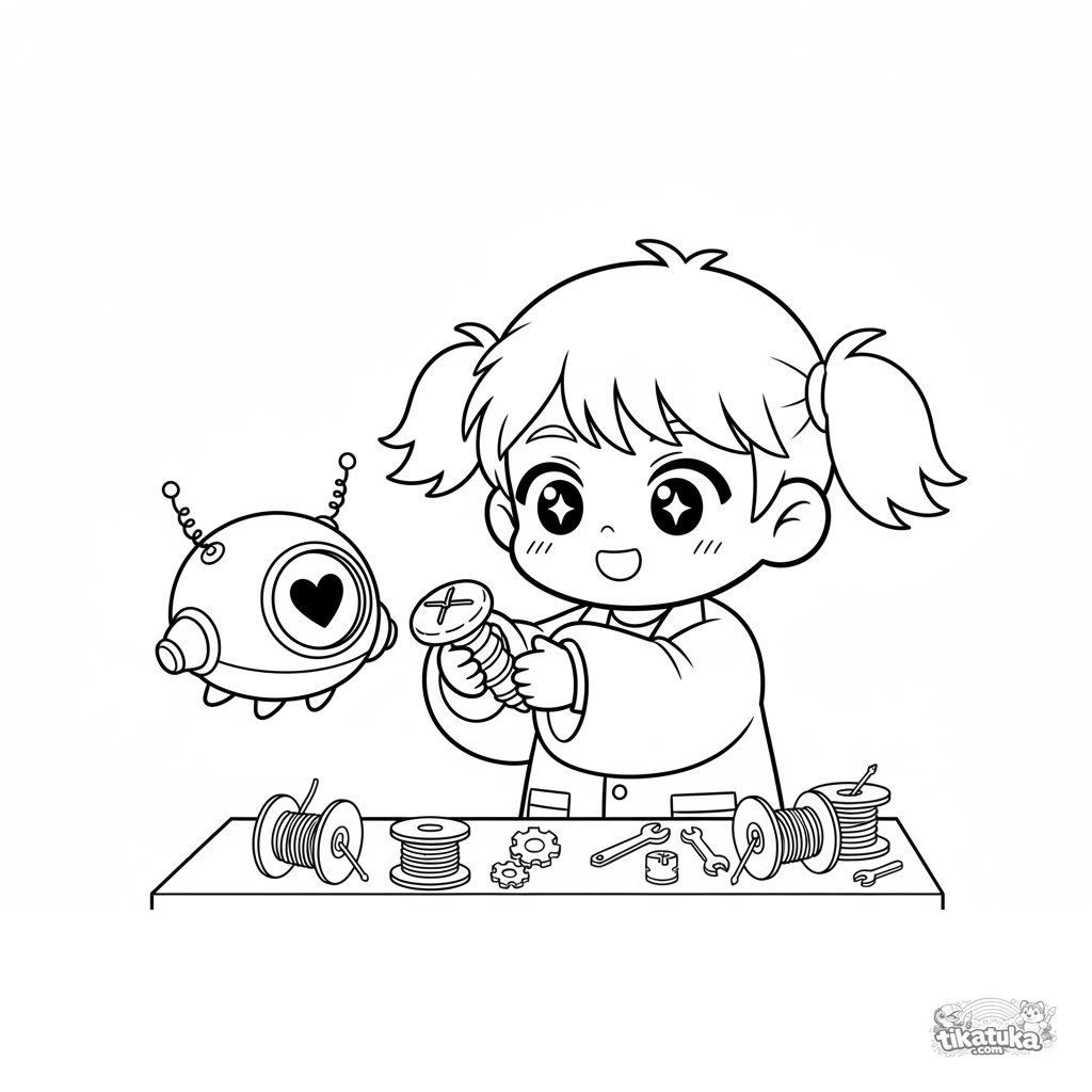 Ausmalbild für Kinder 4-6: Ein süßer Chibi-Junge füttert im Geheimlabor seinen schwebenden Roboter-Hund mit einem Schraubenkeks.