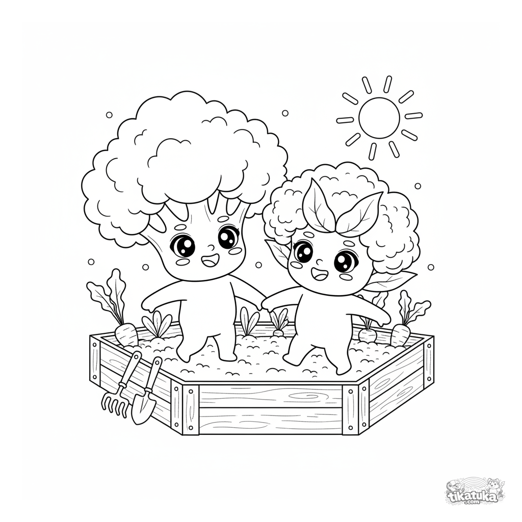 Ausmalbild für Kinder 4-6: fröhliche Chibi-Gemüse, Brokkoli und Blumenkohl, tanzen im Gartenbeet. Helle Charaktere und einfache Szene.