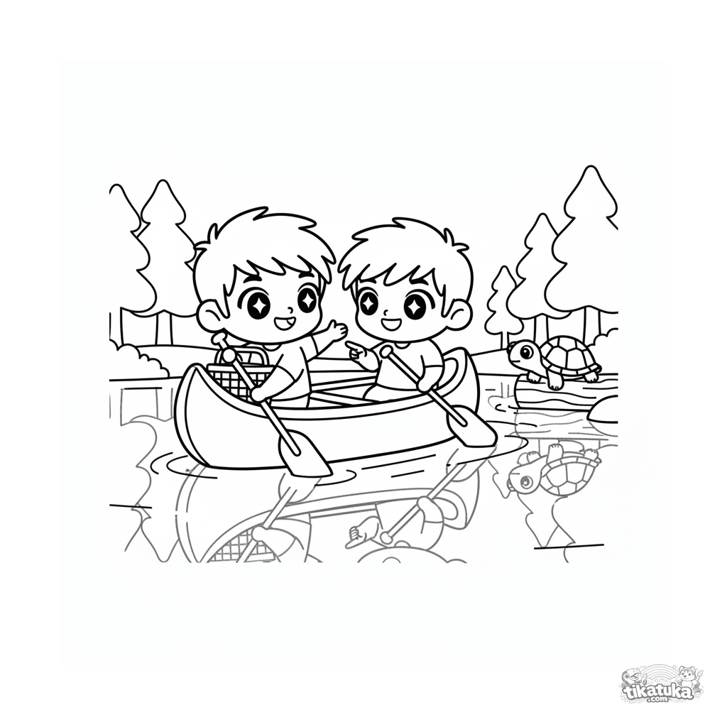 Chibi-Stil Ausmalbild für Kinder 4-6: ein fröhliches Kanu mit zwei Paddlern gleitet auf einem ruhigen Waldsee. Picknickkorb und eine Schildkröte auf einem Baumstamm.