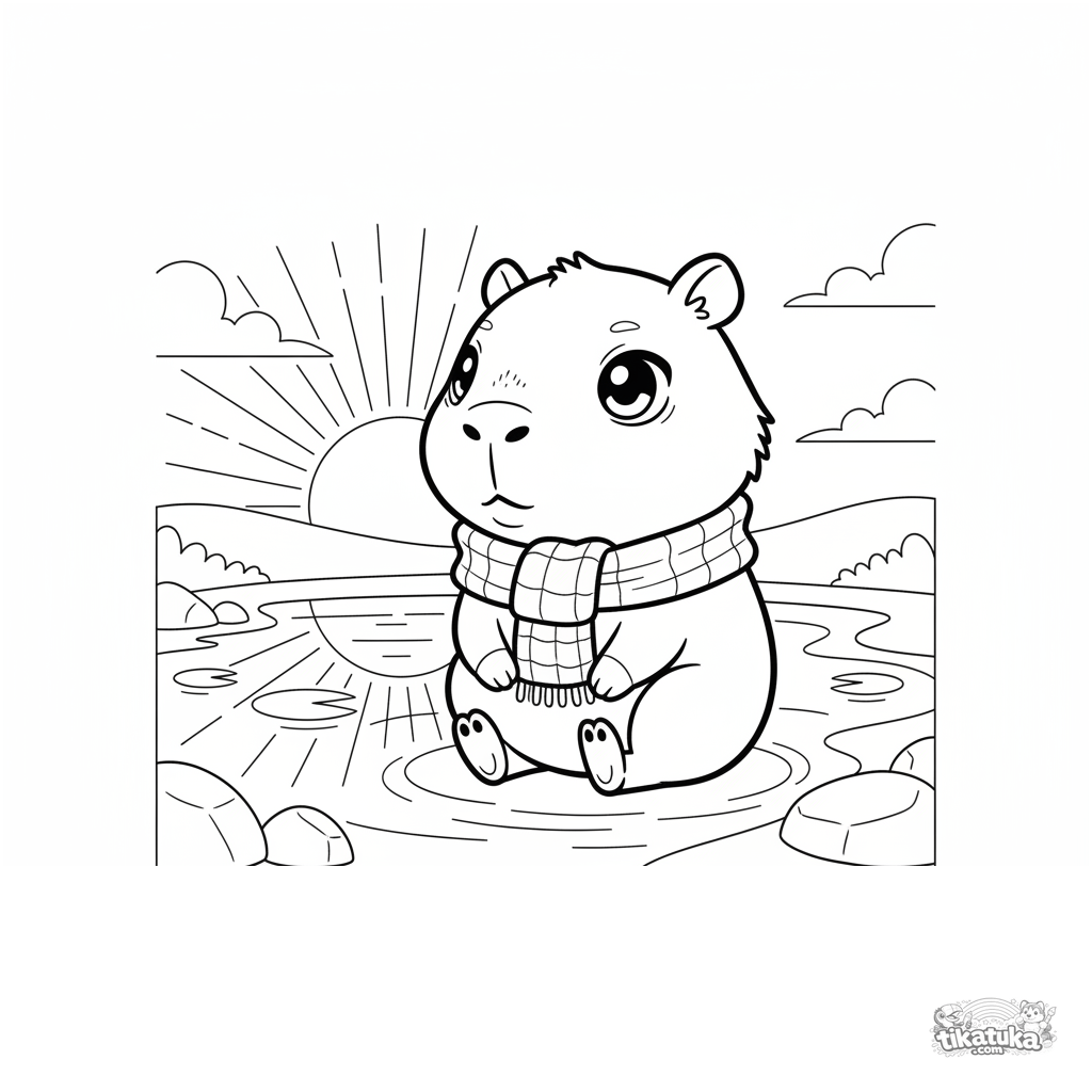 Niedliches Chibi-Capybara mit Schal sitzt an einem Teich bei Sonnenuntergang. Ausmalbild für Kinder von 4-6 Jahren mit einfachen Formen.