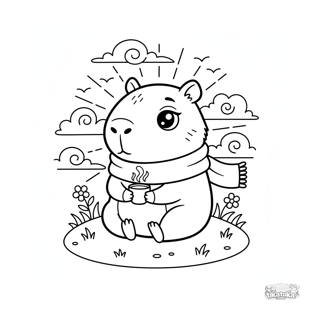 Ausmalbild für Kinder 4-6: Ein süßes Chibi-Capybara mit Schal sitzt auf einem Hügelchen und schaut mit einer Tasse in den Sonnenuntergang. Einfache und niedliche Szene.