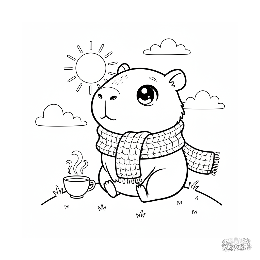Chibi-Stil Ausmalbild: Ein niedliches Capybara mit Schal schaut träumerisch in den Sonnenuntergang. Einfache, süße Szene für Kinder von 4-6 Jahren.