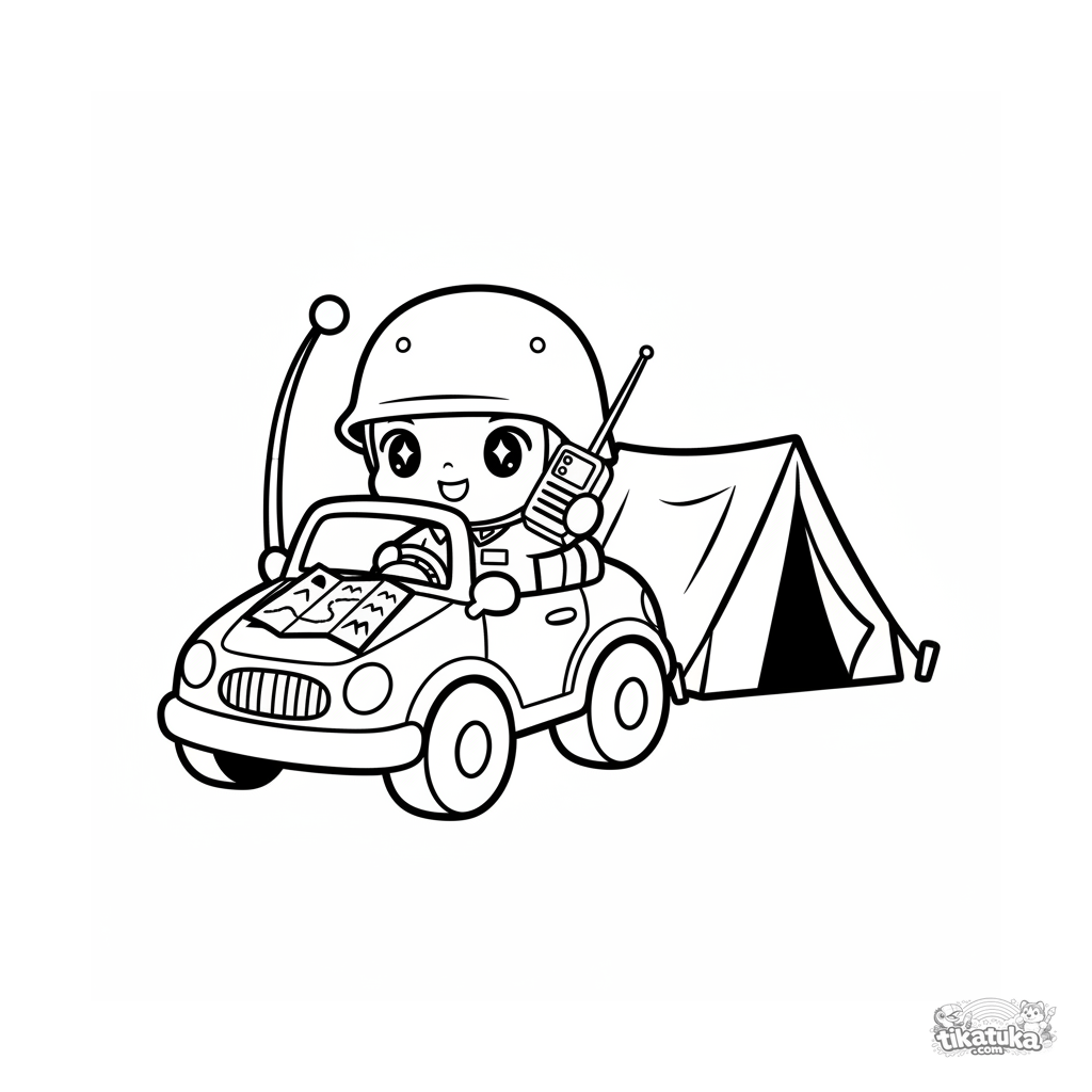 Einfaches Ausmalbild für Kleinkinder 2-3: Ein süßer Chibi-Kommandowagen mit Funkgerät nahe einem Zelt. Große, einfache Formen.