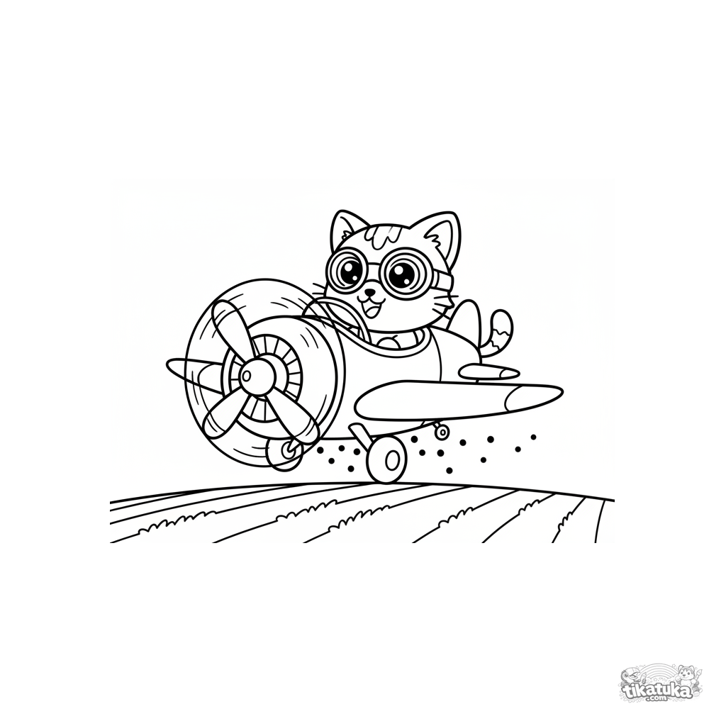 Ein lustiges Chibi-Ausmalbild eines winzigen Sprühflugzeugs, das über Felder fliegt. Eine fröhliche Katze mit Brille schaut aus dem Cockpit. Für Kinder 4-6 Jahre, helle und einfache Formen.