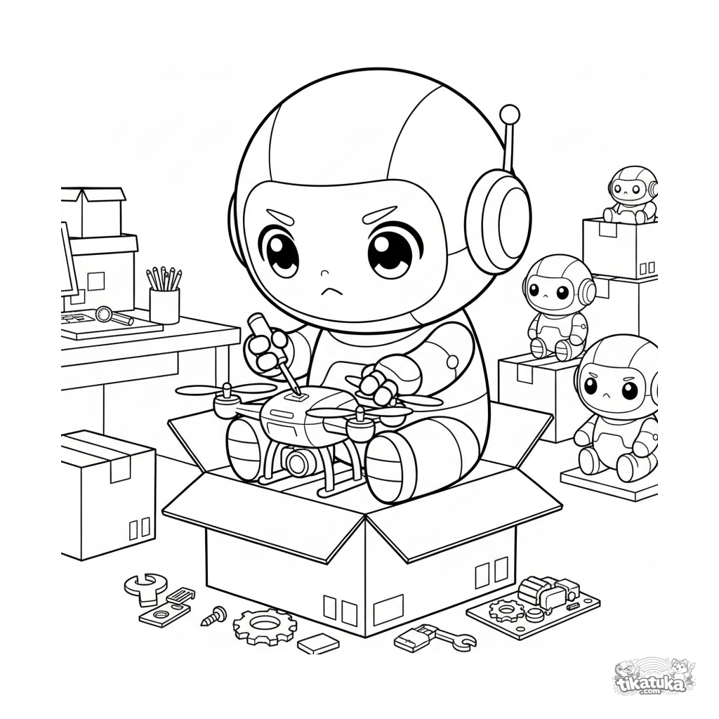 Ausmalbild für Kinder 7-9: Ein niedlicher Anime-style Chibi-Roboter repariert eine Drohne, während er auf einer Kiste in einem Lagerhaus sitzt. Dynamische Pose, ausdrucksstarkes Gesicht.
