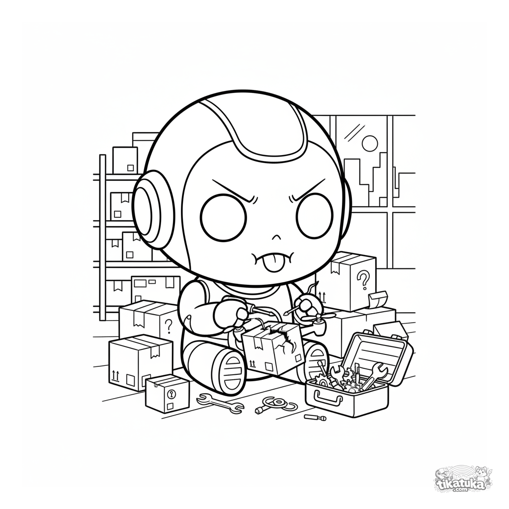 Kinder-Ausmalbild: Ein niedlicher Chibi-Roboter repariert eine kleine Drohne auf dem Lagerboden. Werkzeugkoffer in der Nähe. Lustige Illustration.