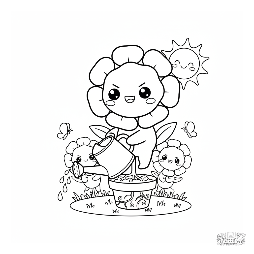 Ausmalbild für 4-6 Jahre: Eine niedliche Chibi-Vergissmeinnicht-Blume mit riesigem Kopf versucht, eine große Gießkanne anzuheben, um sich selbst im Topf zu gießen.