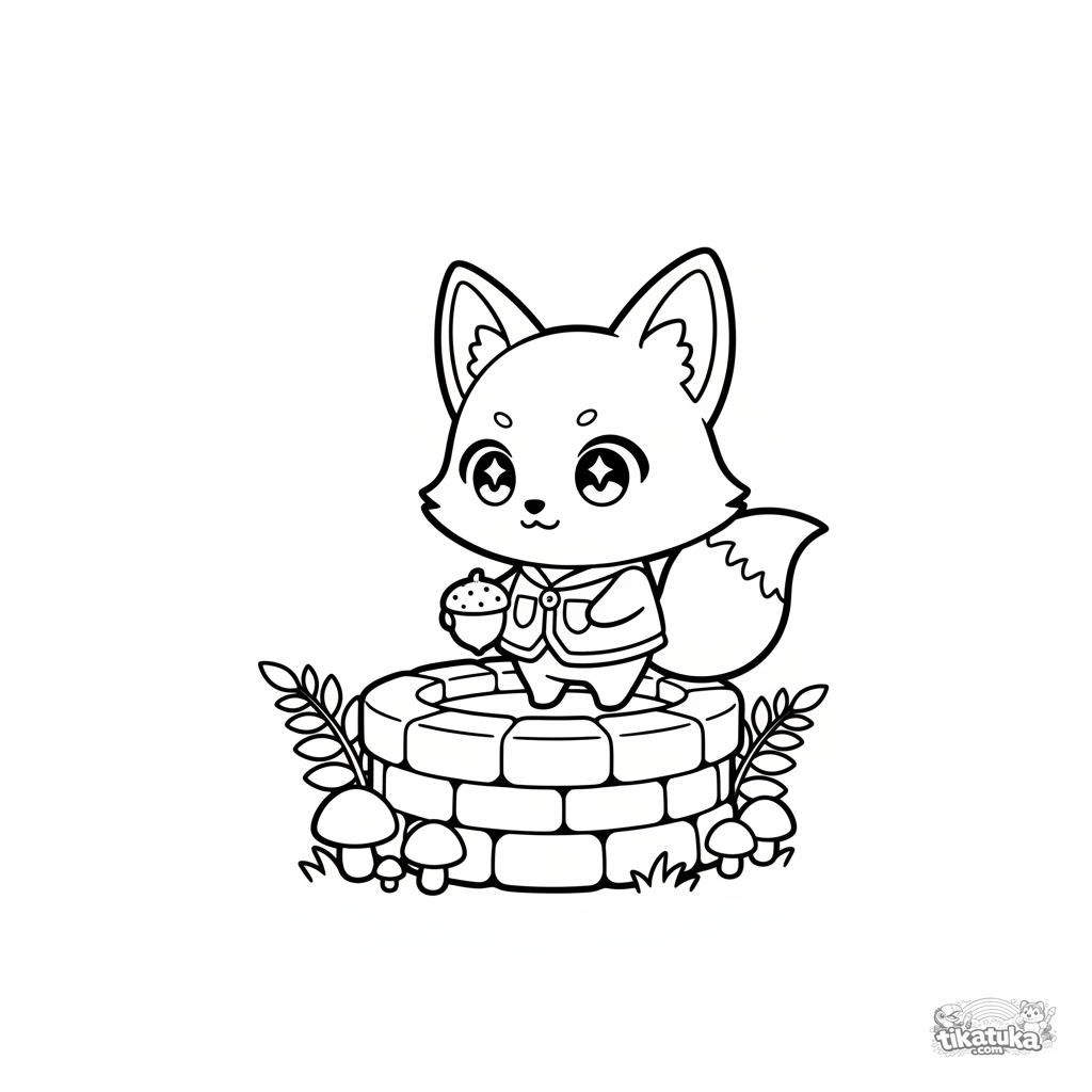 Einfaches süßes Ausmalbild für Kleinkinder 2-3: Ein Chibi-Fuchsgeist schaut in den Brunnen des lebendigen Wassers. Riesiger Kopf, große Augen, einfache Formen.