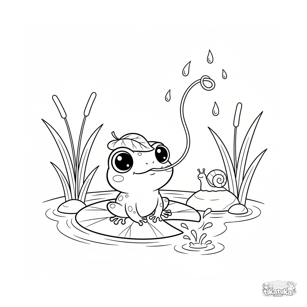 Ausmalbild für Kinder (4-6 Jahre) im Chibi-Stil: ein niedlicher Frosch mit Blatthut sitzt auf einem Seerosenblatt und fängt Regentropfen. Helle ausdrucksstarke Augen, einfache Komposition.