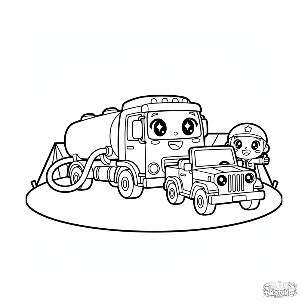 Niedliche Chibi-Ausmalbilder für Kleinkinder 2-3: Ein lächelnder Tankwagen betankt einen Militär-Jeep in der Nähe der Zelte des Feldhauptquartiers.