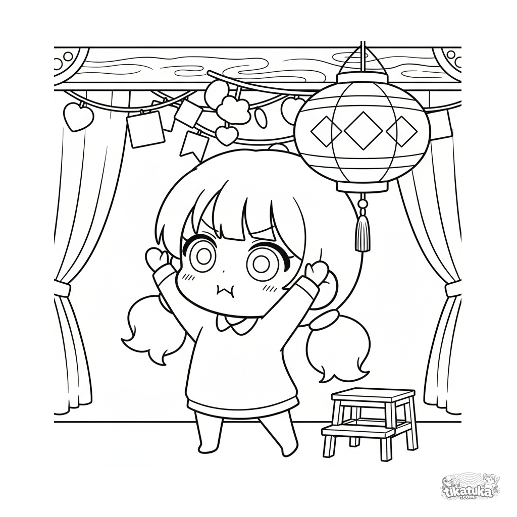 Ausmalbild für Kinder 7-9: Ein süßes Chibi-Mädchen streckt sich, um eine hohe Papierlaterne in einer Festhalle zu erreichen. Vollkörper, breite weiße Ränder.