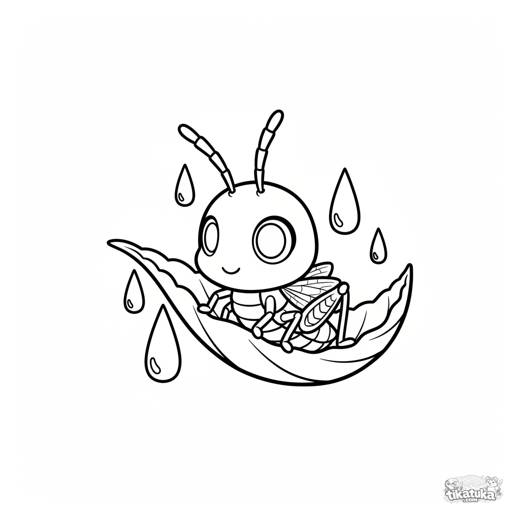 Ausmalbild für 7-9 Jahre: Ein süßer Chibi-Grashüpfer lugt unter einem Blatt mit Tautropfen hervor. Lustige, ausdrucksstarke Szene.